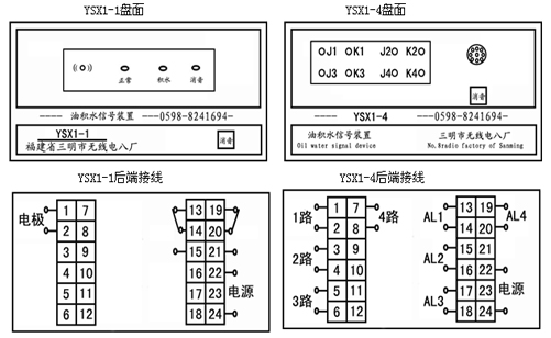 YSX1油積水信號裝置安裝于油箱底部。當(dāng)油箱內(nèi)油混有水并沉積于底部電極裝置時,信號裝置內(nèi)的集成控制電路能發(fā)出報警信號,運行人員可打開電極裝置的Gl/4直嘴旋塞把水放掉。YSX1-1為一路監(jiān)測配套儀表;YSX1-4為4路監(jiān)測配套儀表。