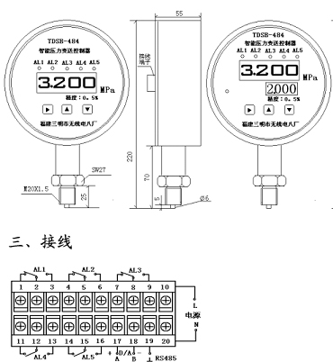 TDSB-484ZL系列壓阻式智能數(shù)顯壓力變送器、控制器是集壓力測(cè)量、顯示、控制于一體的多功能產(chǎn)品。該產(chǎn)品為全電子數(shù)字技術(shù)。結(jié)構(gòu),前端采用帶隔離膜充油芯體的壓阻式壓力傳感器,輸出信號(hào)由高精度、低溫漂和高可靠性的放大電路轉(zhuǎn)換為標(biāo)準(zhǔn)信號(hào)。它使用方便,參數(shù)在儀表盤面設(shè)定,廣泛應(yīng)用于電力、自來水、水處理、石油、化工、冶金等行業(yè),對(duì)流體介質(zhì)的壓力進(jìn)行監(jiān)控,是指針電接點(diǎn)壓力表的理想替代產(chǎn)品。