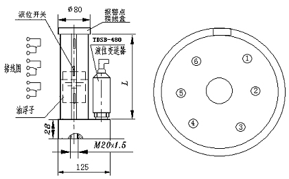 報警點接線盒:端子1、2為上限,液位高于上限時斷開,低于上限時閉合;端子3、4為中點,液位高于中點時斷開,低于中點時閉合;端子5、6為下限,液位低于下限時閉合,高于下限時斷開。
